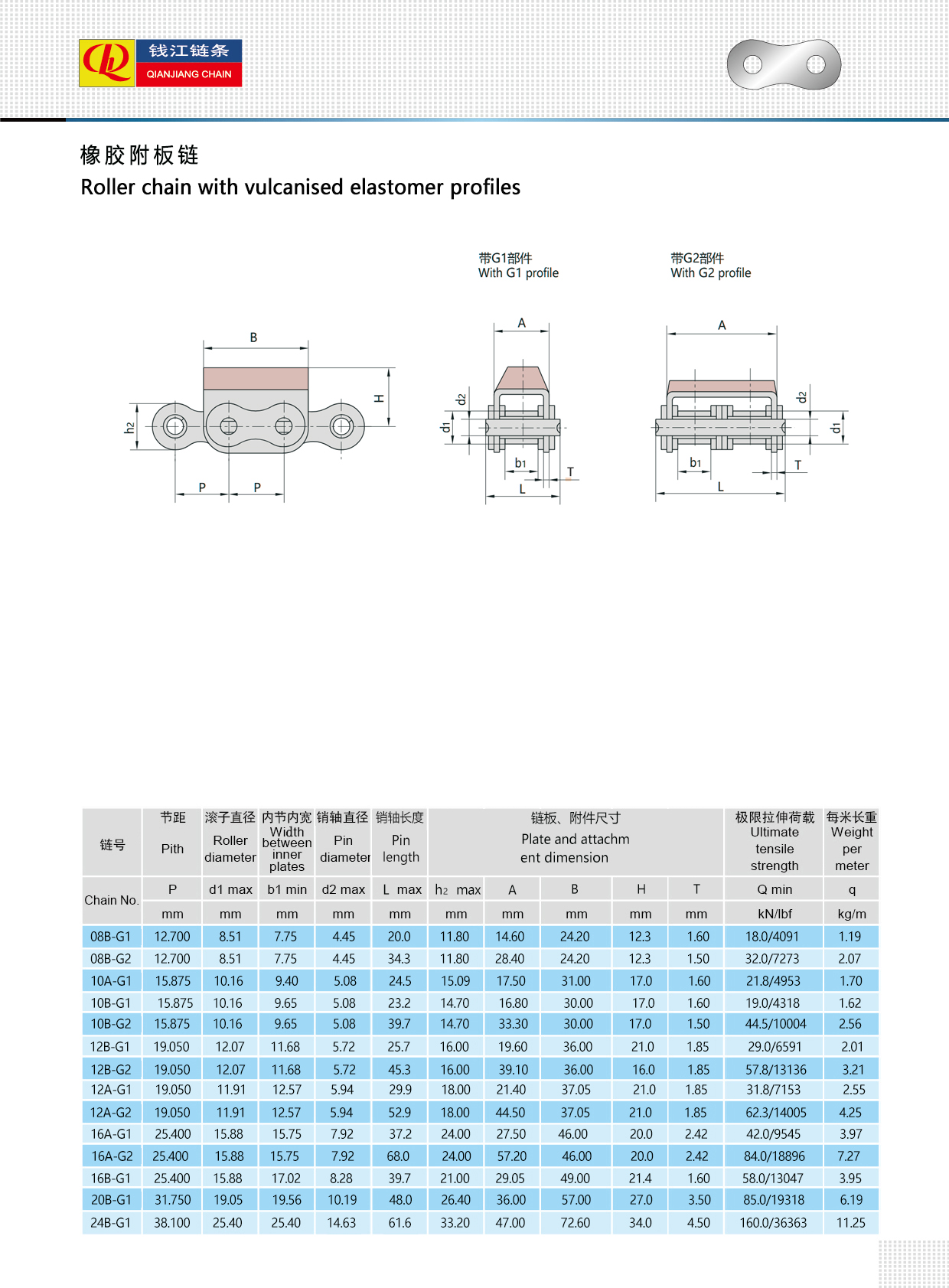 現代の産業オートメーション生産では、材料搬送システムの安定性と効率が全体の生産能力と品質に直接影響します。加硫エラストマープロファイルを備えたローラーチェーンは、高性能の統合伝動および搬送ソリューションとして、食品加工、物流仕分け、農業機械、包装機器などの分野で広く使用されており、その耐摩耗性、衝撃吸収性、滑り止め特性が際立っています。加硫エラストマープロファイルを備えたローラーチェーンは、標準的なローラーチェーンをベースにしており、高度な加硫プロセスを使用して、高品質のゴムまたは熱可塑性エラストマーをチェーンの外側チェーンプレートまたはベアリングプレートに強固に接着します。この複合構造は、金属チェーンの高い強度と耐久性を維持するだけでなく、次のような独自の利点ももたらします。