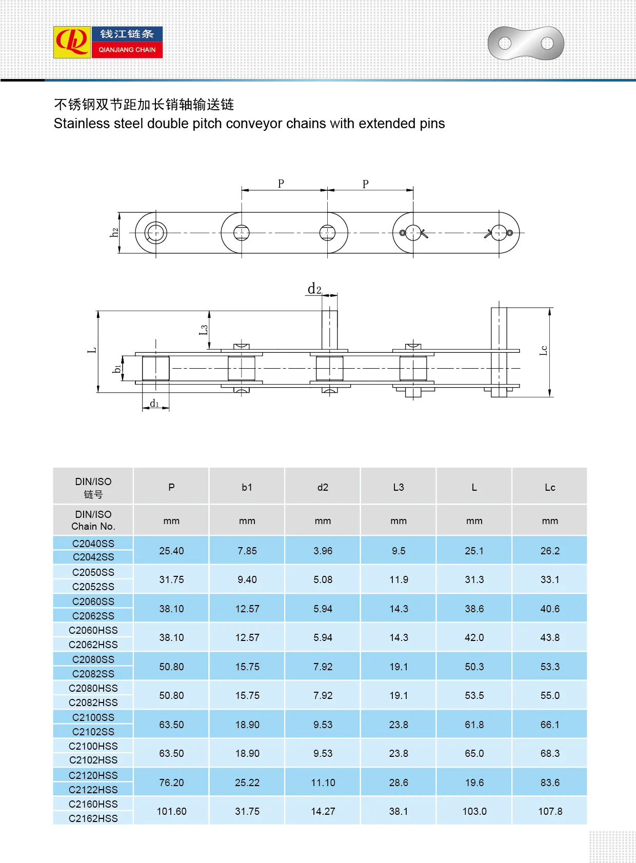 拡張ピンを備えたステンレス鋼ダブルピッチコンベヤチェーンは、耐久性と多用途性を考慮して設計されており、要求の厳しい産業用途に最適です。高品質のステンレス鋼で作られたこれらのチェーンは、食品加工、化学工場、屋外作業などの過酷な環境でも優れた耐食性を発揮します。ダブルピッチ設計により、よりスムーズで静かな動作と長距離にわたる効率の向上が可能になる一方、延長されたピンによりアタッチメントやカスタム治具をチェーンに直接取り付けるための柔軟性が提供され、不規則なアイテムやかさばるアイテムを搬送することができます。